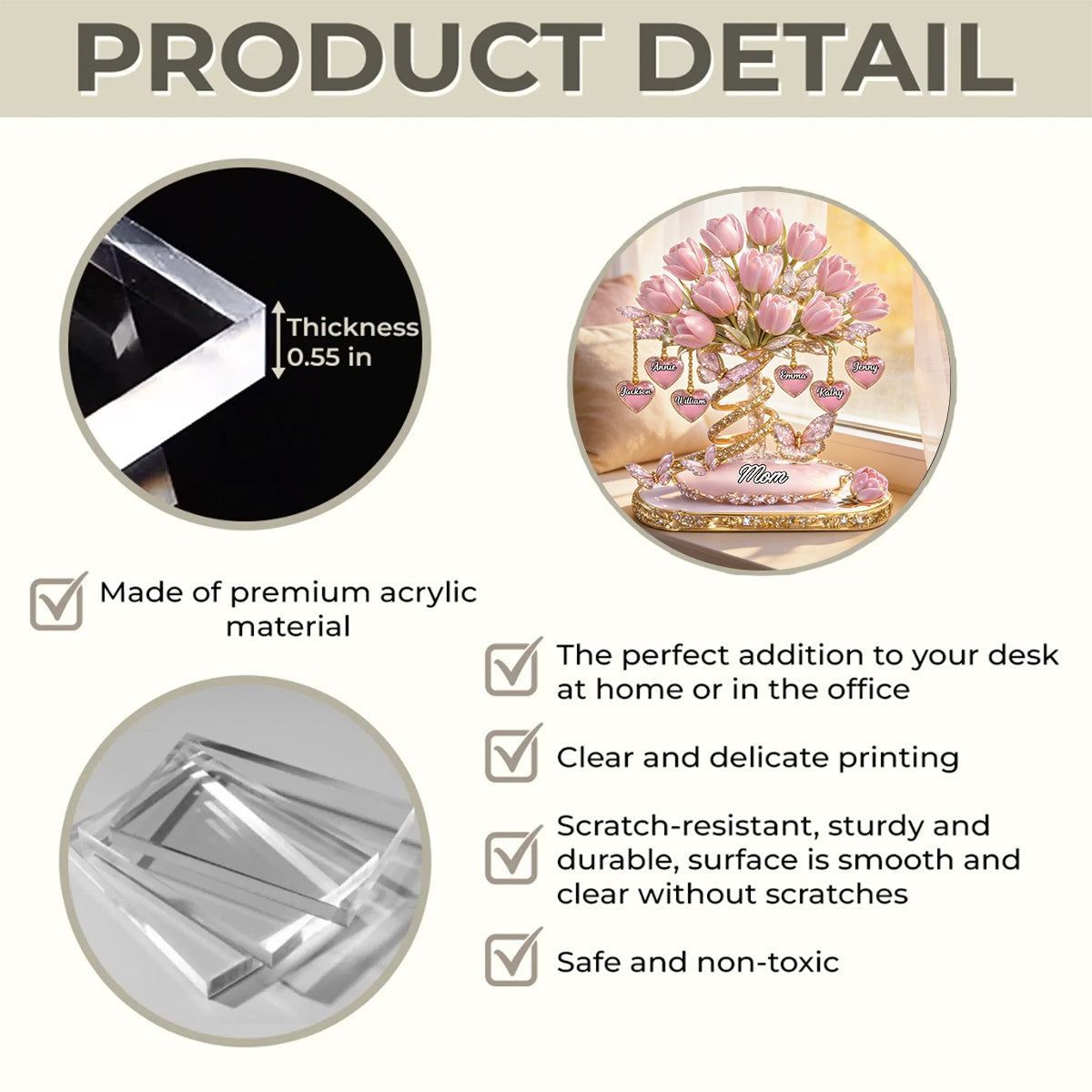 Diese personal isierte Acryl plakette ehrt diese Liebe mit einem Strauß Tulpen-jede Blüte trägt den Namen eines Kindes, in das sie ihr Herz gegossen hat. Es ist mehr als nur Dekor, es ist eine tägliche Erinnerung daran, dass ihr größtes Meisterwerk nicht an einer Wand hängt. Es geht durch die Welt, geprägt von ihrer Fürsorge. Maßge schneidert mit den Namen ihrer Kinder fängt es das Licht so ein, wie sie jeden Meilenstein, jeden Herzschmerz, jede Freude fängt. Platzieren Sie es dort, wo sie es jeden Tag sehen wird, und lassen Sie es flüstern, was Worte manchmal nicht können:Sie werden gesehen, Sie werden geschätzt, Sie sind das Herz dieser Familie.