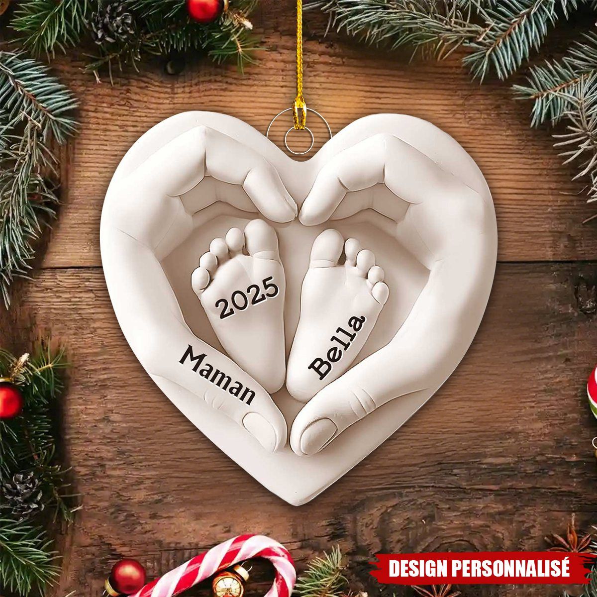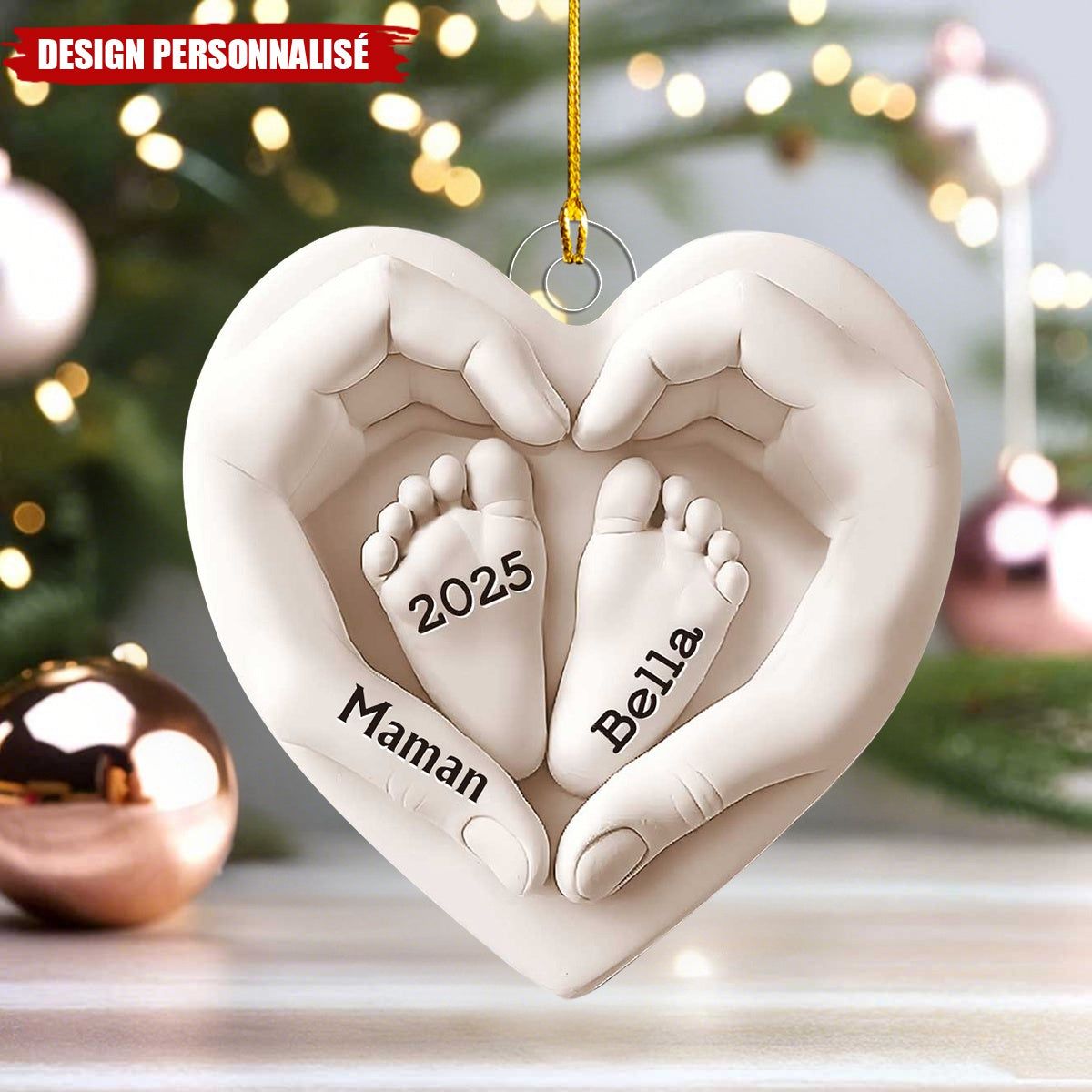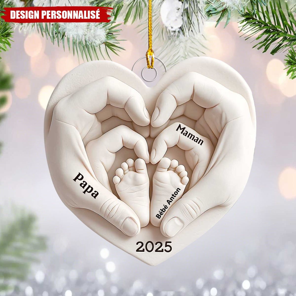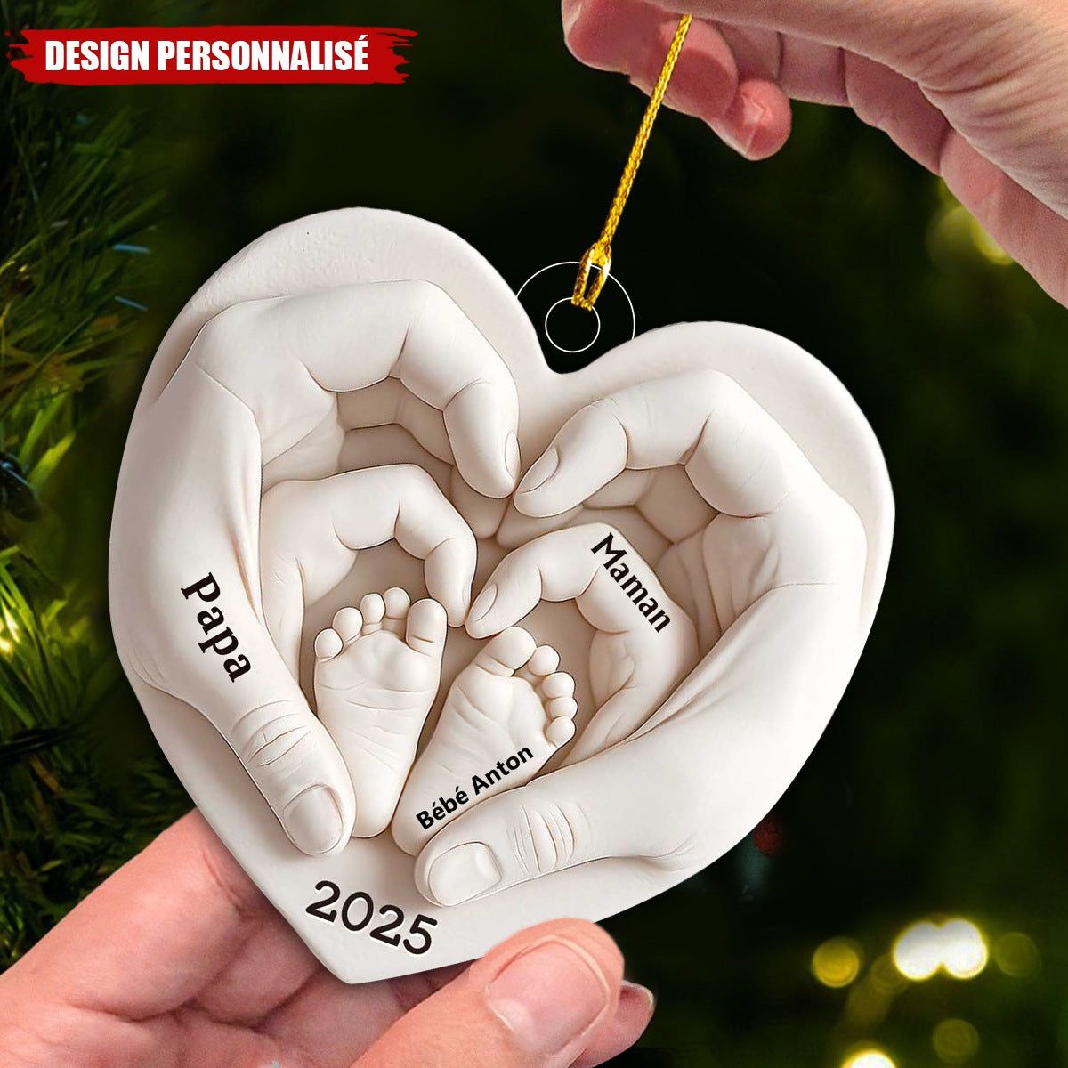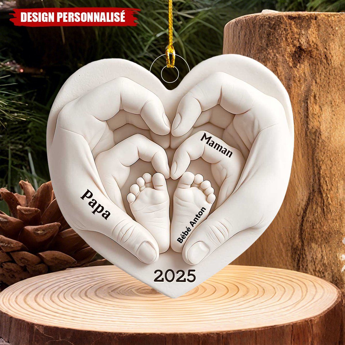 Célébrez l’arrivée d’un nouveau membre dans votre famille avec notre magnifique Ornement Cœur Personnalisé. Conçu avec amour, il présente des empreintes de pieds de bébé délicatement sculptées entourées des mains protectrices des parents, formant un cœur symbolique d’amour et de tendresse.