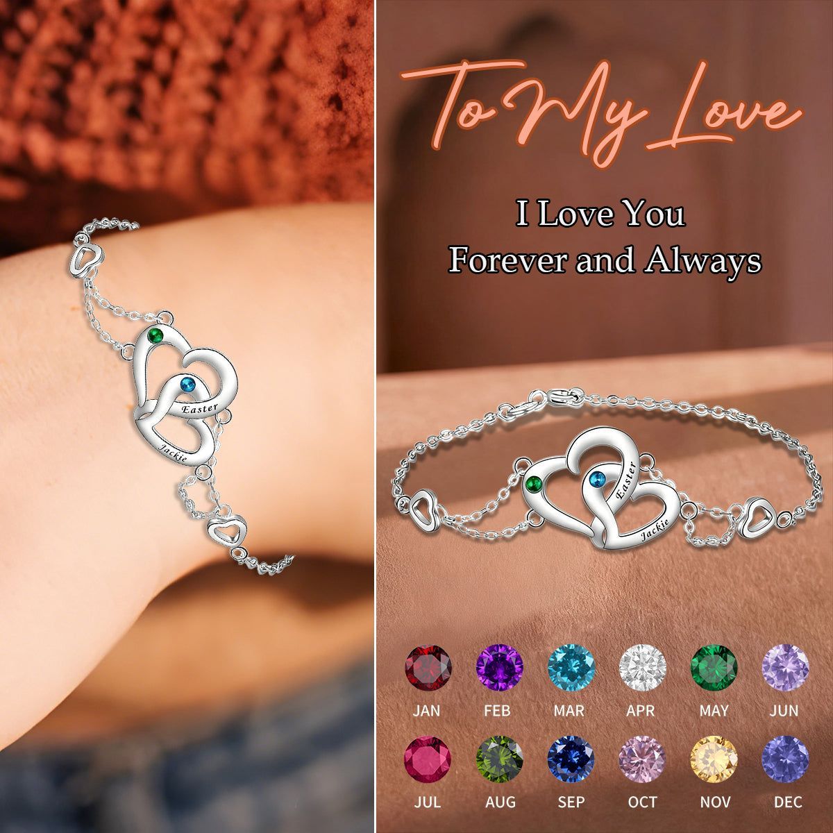 Introducing our Personalized two Heart Bracelets for Women. These custom bangle bracelets are the perfect gift for any special woman in your life. The bracelets feature two beautifully crafted heart charms that can be engraved with the names of your and your lover. Each bracelet also includes two birthstones, adding a personalized touch to the design.Meticulously crafted, the intertwined hearts create a meaningful canvas for your love story.
