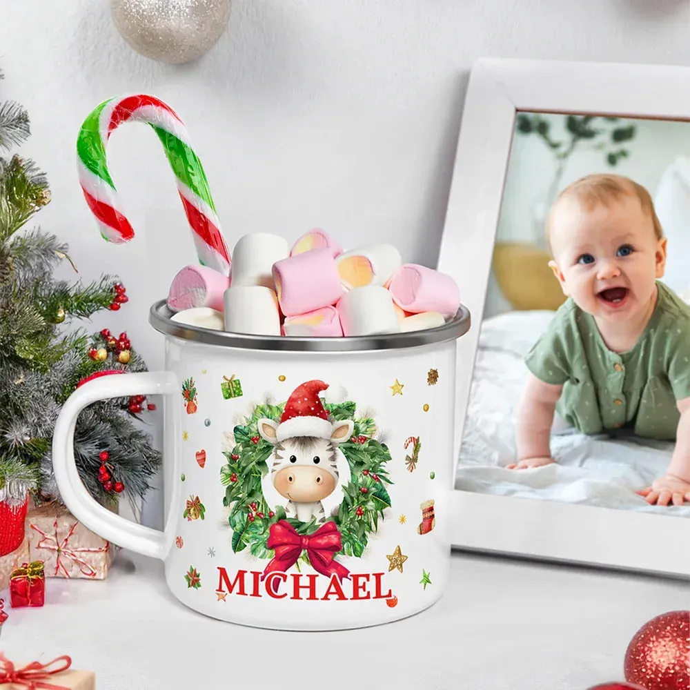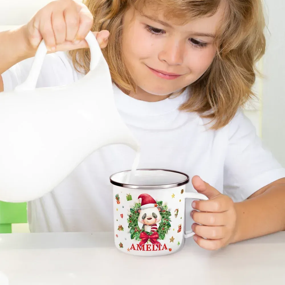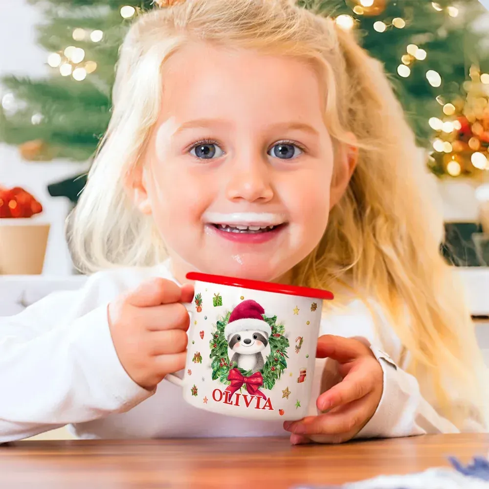 Personalisierte Emaille-Tasse mit Namen, verziert mit einem Kranz, Cartoon-Weihnachtshut und Tiermotiven – das perfekte Weihnachtsgeschenk für Familie und Kinder